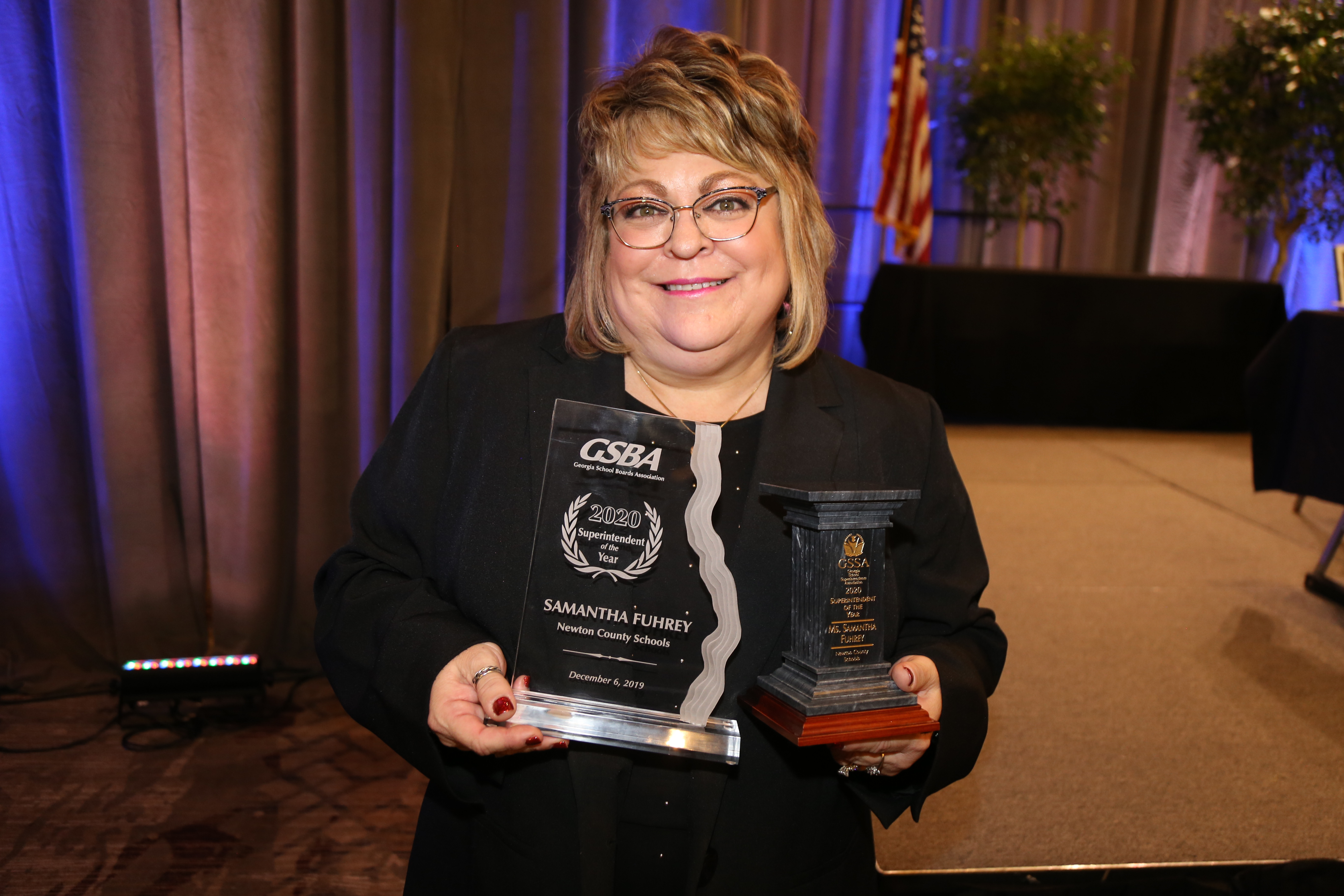 Congratulations to Samantha Fuhrey of Newton County Schools for being named the 2020 Georgia Superintendent of the Year. The announcement and the award was presented to Mrs. Fuhrey on December 6th at the GSBA/GSSA Annual Conference in Atlanta. Fuhrey has now been selected as one of the four national finalists for National Superintendent of the Year out of the rest of the state finalists from across the nation . The National Superintendent of the Year award will be announced at the AASA Annual Conference in San Diego February 12-14, 2020.